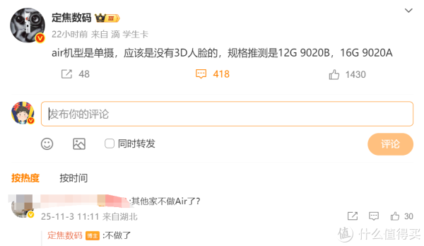 最后是性能方面,博主定焦数码爆料华为Mate70 Air有两个版本,12GB内存版本搭载麒麟9020B处理器,16GB版本搭载麒麟9020A处理器。虽然同样是麒麟9020系列处理器,性能有一些小差异,包括核心规格与频率等参数,理论上当然是16GB运行内存版本性能更强,体验也会更好。